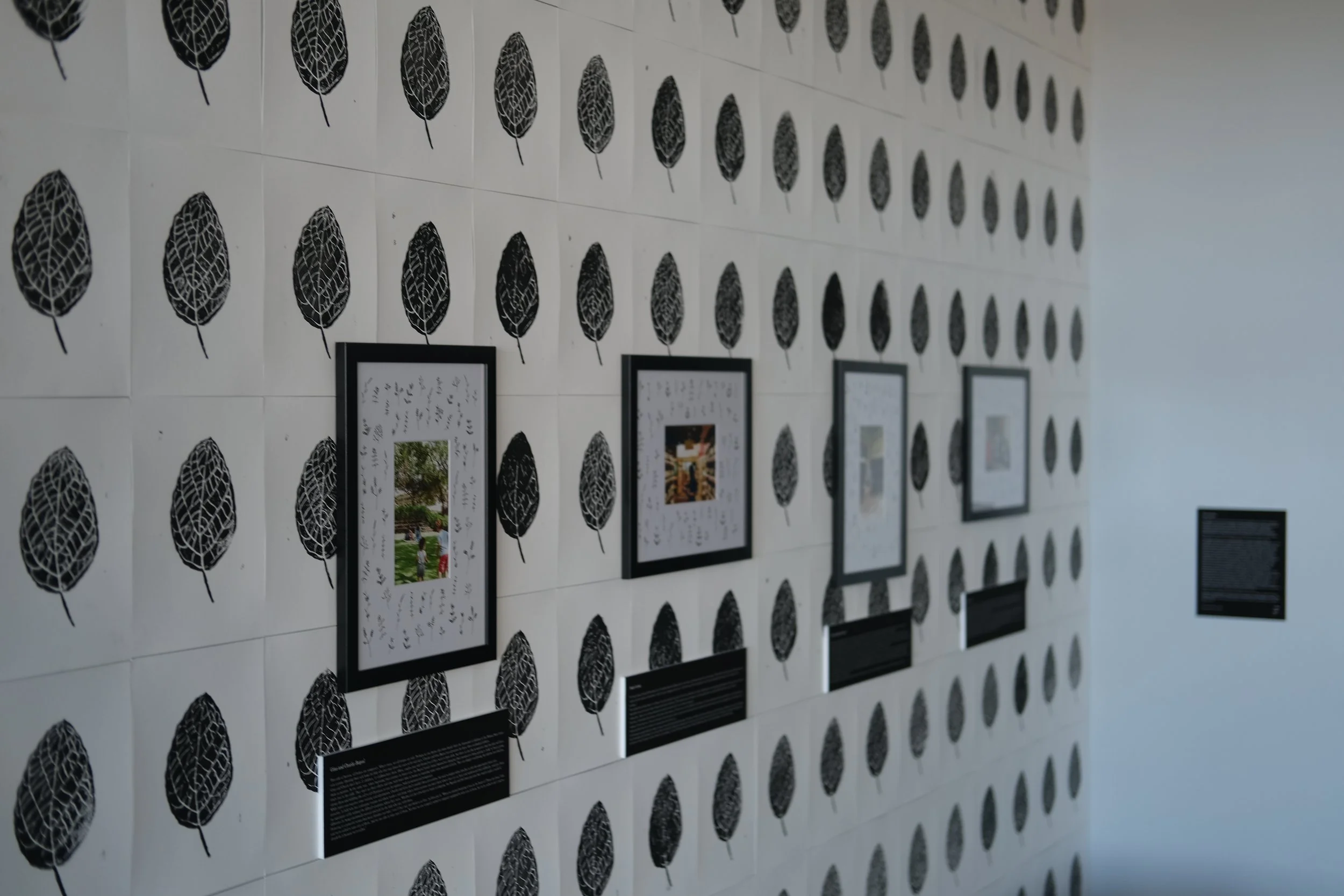 In the final work, the pen drawings are intended to evoke a sense of individual beauty, with each plant being unique, drawn slightly differently even from its same-species counterparts. Filling the matting in the frame plays into the idea that the work done by the featured people is generously given. These themes are carried into the papered wall of leaf prints, each print challenging uniformity with differences and discrepancies kept and valued. The prints carry the motif of fingerprints, inked on a card, expressing the ideas of the image of God, endowed on every person touched by the ministries of those featured, and the presence, grit, and hands-on nature of the work they are doing. You have to be physically present to make a fingerprint. You have to touch something that will leave a mark. You quite literally have to get your hands dirty. Accompanying this with the previously discussed theme of abundance, The Fields presents a field of prints, with gardens in the frames, displaying the present, patient, persistent work these people do, and the unique, image-bearing beauty of the people they serve.